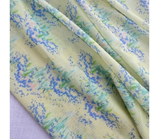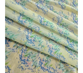 ¡Descubre la magia de nuestro tul elástico estampado! Con un hermoso diseño de manchas que evocan delicadas flores en tonos verdes y azules, esta tela es perfecta para dar vida a tus proyectos creativos.