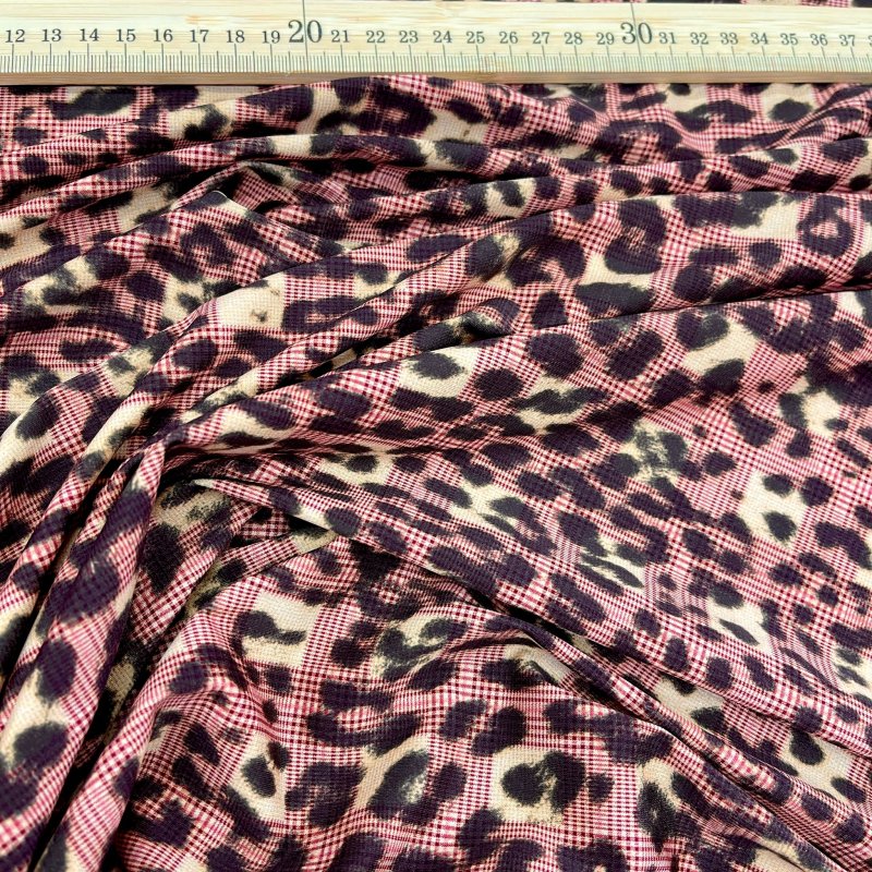 Lycra estampada animal print y cuadros en tonos fucsia y morado. Tejido elástico, cómodo y resistente, ideal para bikinis, bañadores y leggings..