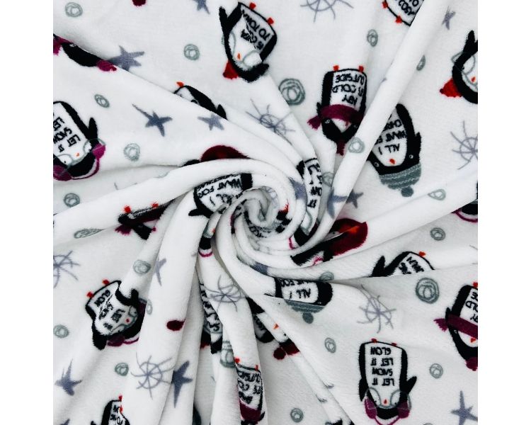 Tela de coralina estampada con pingüinos robots, ancho 140 cm. Muy suave y cálida, ideal para mantas, pijamas, ropa de casa o manualidades infantiles.