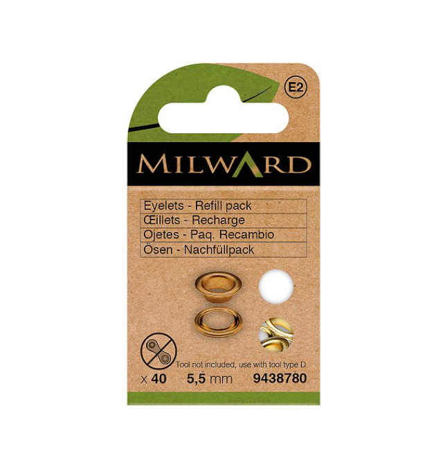 El pack de ojetes de 5,5 mm Milward es la opción ideal para reforzar y decorar tus proyectos de costura y manualidades con un acabado profesional. Este set de recambio incluye ojetes resistentes y duraderos, perfectos para aplicar en una gran variedad de materiales.