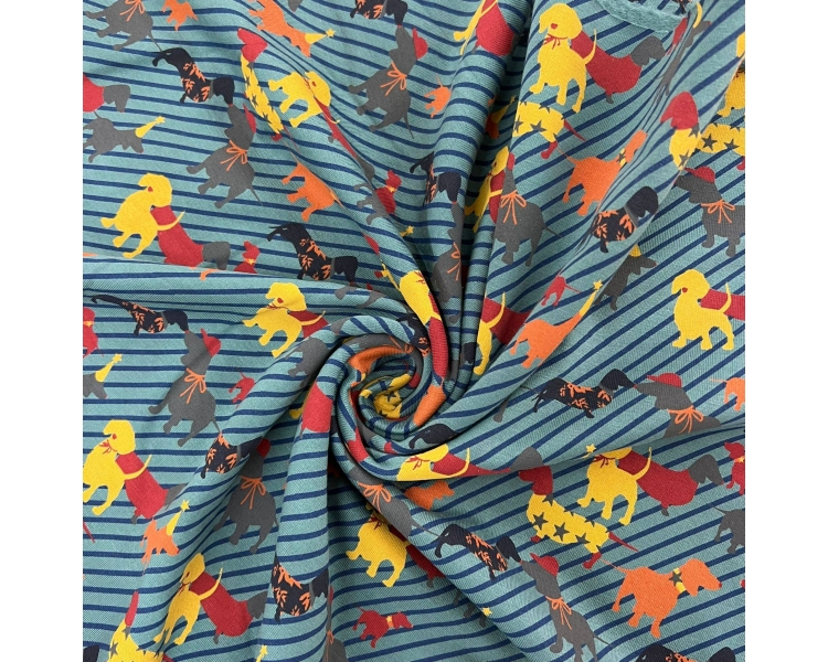 ¡Descubre nuestra encantadora tela French Terry estampada con adorables perros y elegantes líneas!