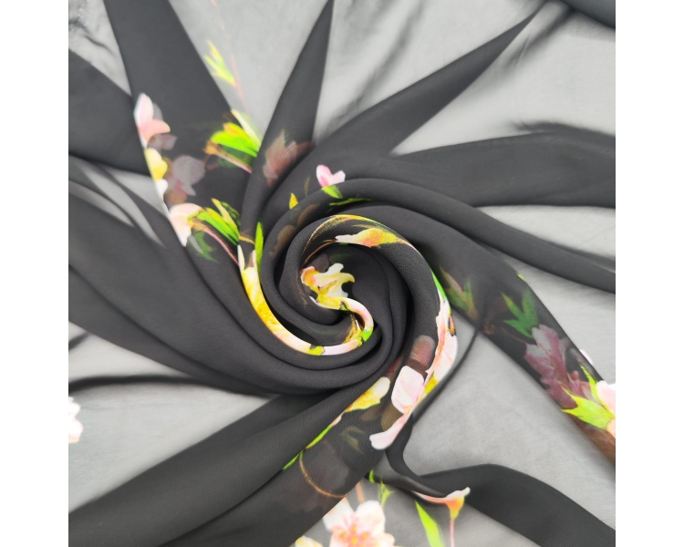 Deja que tu creatividad florezca y diseña piezas únicas y llenas de encanto con nuestra tela de gasa negra estampada con flores.