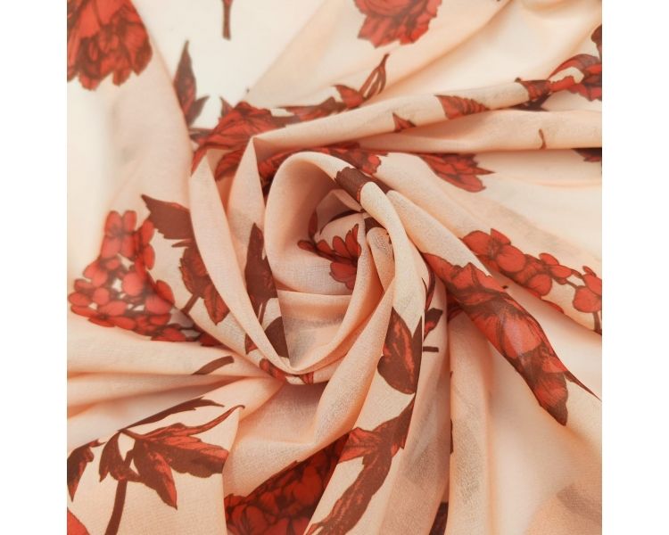 El estampado de flores rojas sobre el fondo salmón le confiere un estilo vibrante y romántico a cualquier prenda que confecciones. Ya sea que desees diseñar una blusa alegre, un vestido encantador o un pañuelo delicado, esta gasa es la elección ideal.