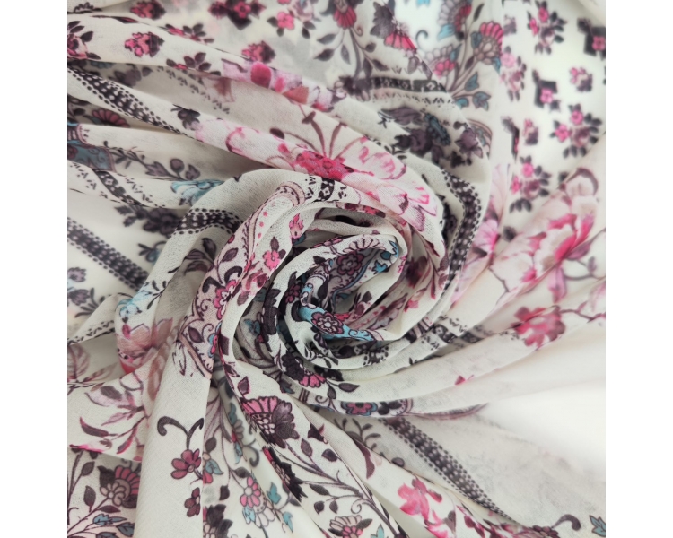 ¡Tela de gasa con un hermoso diseño de fusión floral y cachemir! Perfecta para crear prendas ligeras y elegantes, esta tela combina la suavidad de la gasa con un estampado vibrante que realza cualquier outfit.