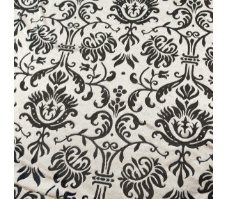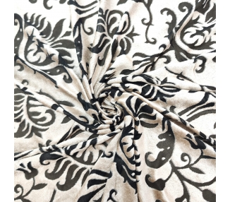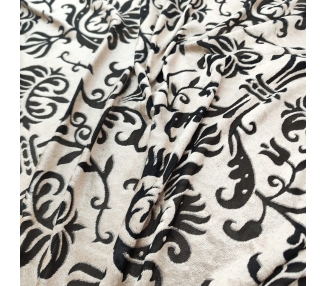 ¡Descubre nuestra exclusiva tela de terciopelo elástico estampado! Con un elegante diseño que fusiona el clásico motivo de flor de lis y damasco, esta tela es perfecta para darle un toque sofisticado a tus proyectos. Además, cuenta con delicadas transparencias en tul negro que añaden un aire de misterio y glamour.