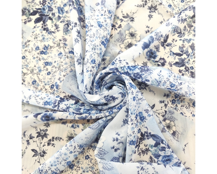 ¡Hermosa tela de gasa azul con estampado de flores en tonos azul y gris! Esta tela ligera y transparente es perfecta para confeccionar blusas, vestidos o bufandas que te harán lucir radiante ya la moda.
