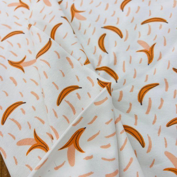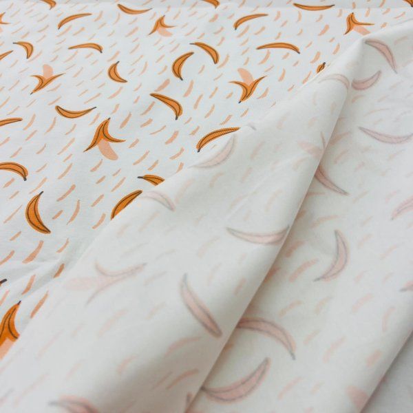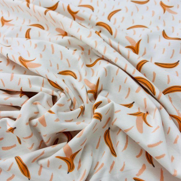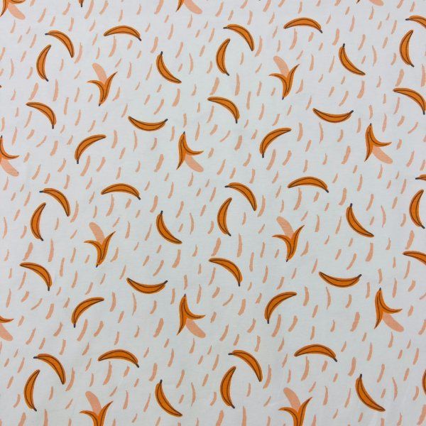 ¡Tela de punto de algodón estampada con alegres bananas! Ideal para confeccionar prendas cómodas y frescas, como camisetas, vestidos o pijamas.