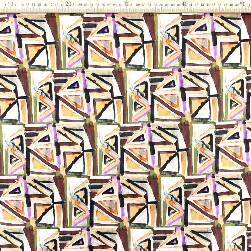 Lycra estampada con diseño geométrico abstracto multicolor, en tonos tierra como marrón, beige, mostaza y verde, combinados con detalles en negro y morado. Este tejido es elástico, resistente y de secado rápido, perfecto para confeccionar bikinis, bañadores, leggings, ropa deportiva, maillots de danza y prendas ajustadas de moda urbana.
