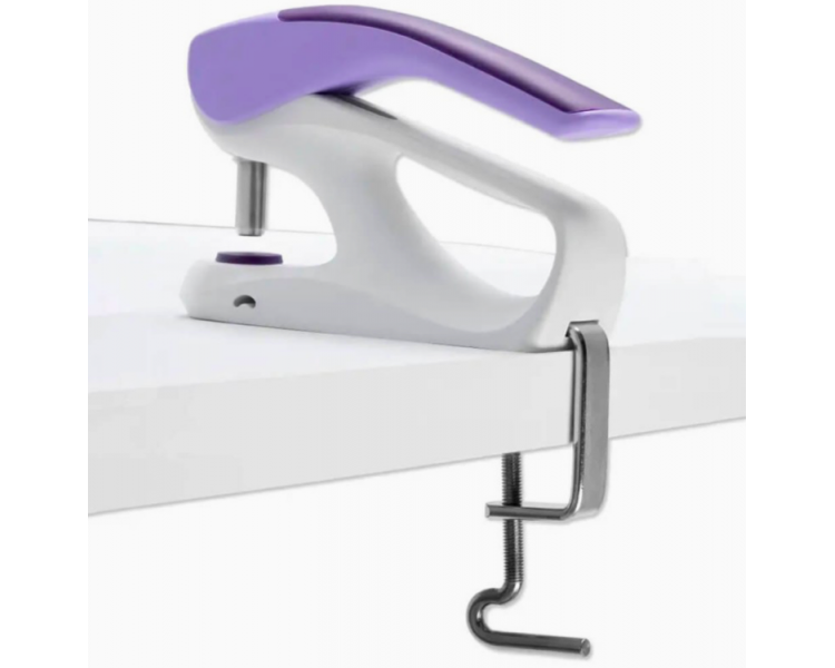 La abrazadera de mesa te permite asegurar la herramienta en el tablero de la mesa o en cualquier superficie de trabajo, mientras perforas, aplicas broches, ojales o remaches.