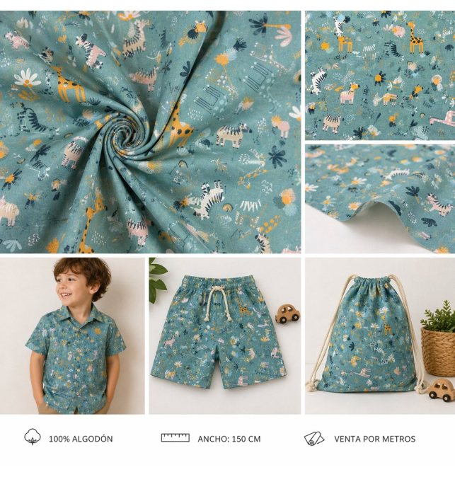 La tela de algodón 100% con estampado infantil de animales safari sobre fondo verde es un tejido suave, transpirable y de alta calidad, ideal para confección y proyectos de costura creativa. Su diseño combina jirafas, cebras y elementos naturales con un estilo ilustrado moderno, creando un acabado alegre y decorativo perfecto para el mundo infantil.