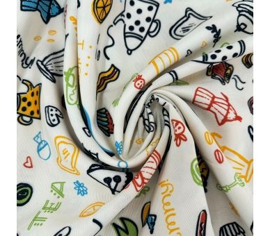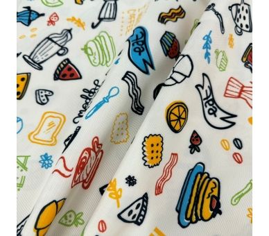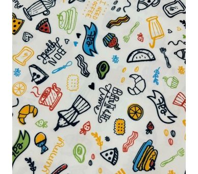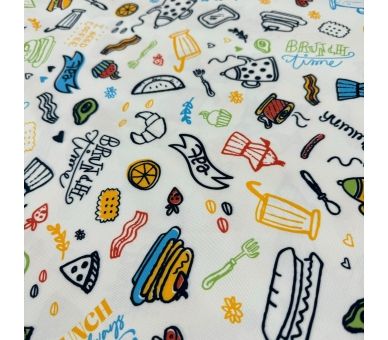 Esta tela de mantelería, con un encantador estampado de productos de cafetería, es ideal para crear un ambiente acogedor y cálido. Con un ancho de 160 cm, se adapta perfectamente a mesas grandes y pequeñas, aportando un toque distintivo a cualquier espacio.