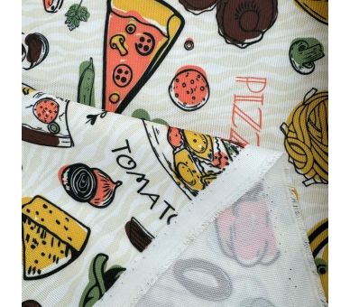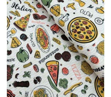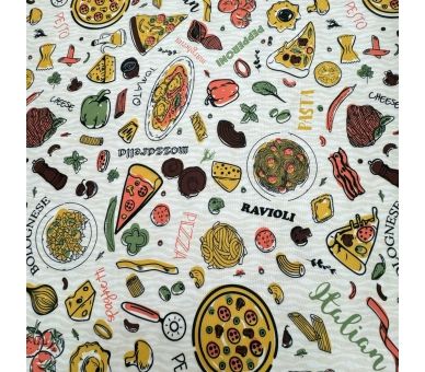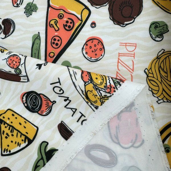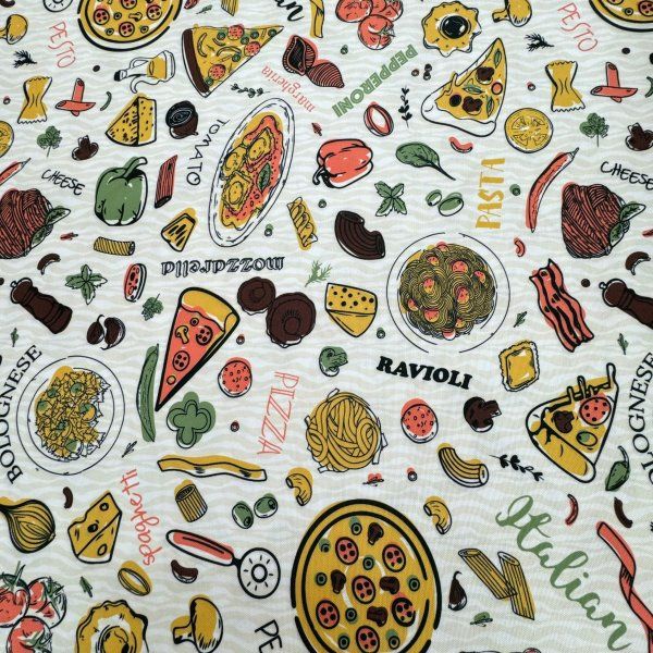 Esta tela de mantelería con un divertido estampado de pizzería es la elección perfecta para los amantes de la buena comida. Con un ancho de 160 cm, proporciona una cobertura ideal para mesas en restaurantes o en casa.