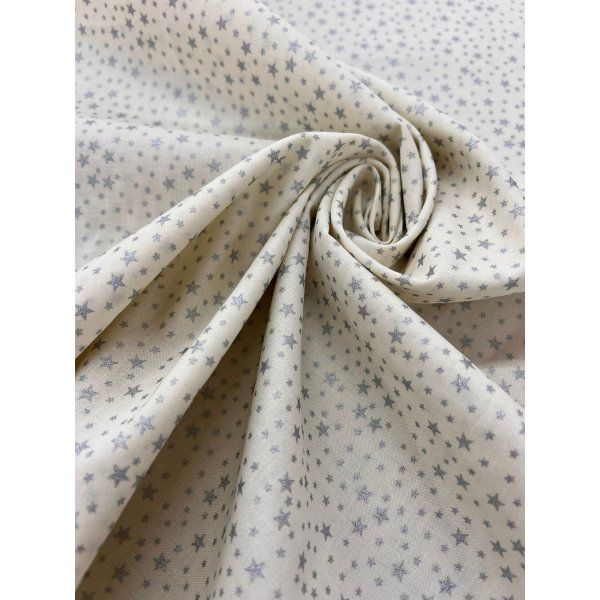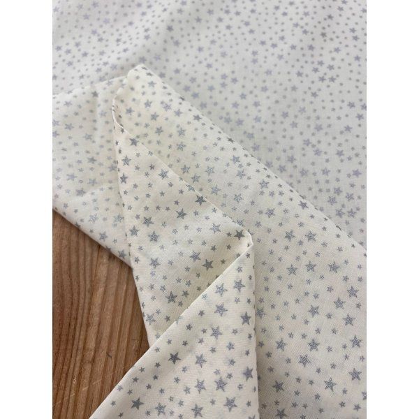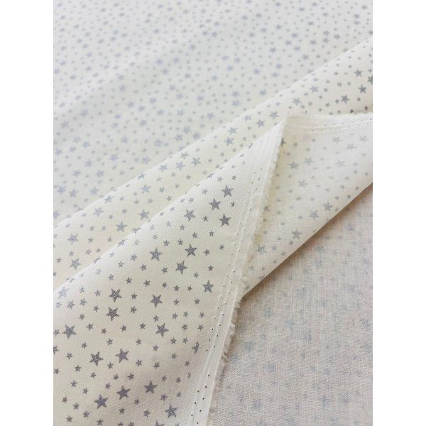 ¡Tela de algodón para patchwork estampado! Diseñada especialmente para los amantes del quilting y las manualidades, esta tela presenta un hermoso patrón de mini estrellas en color plata sobre un fondo blanco puro, que aportará elegancia y brillo a tus creaciones.