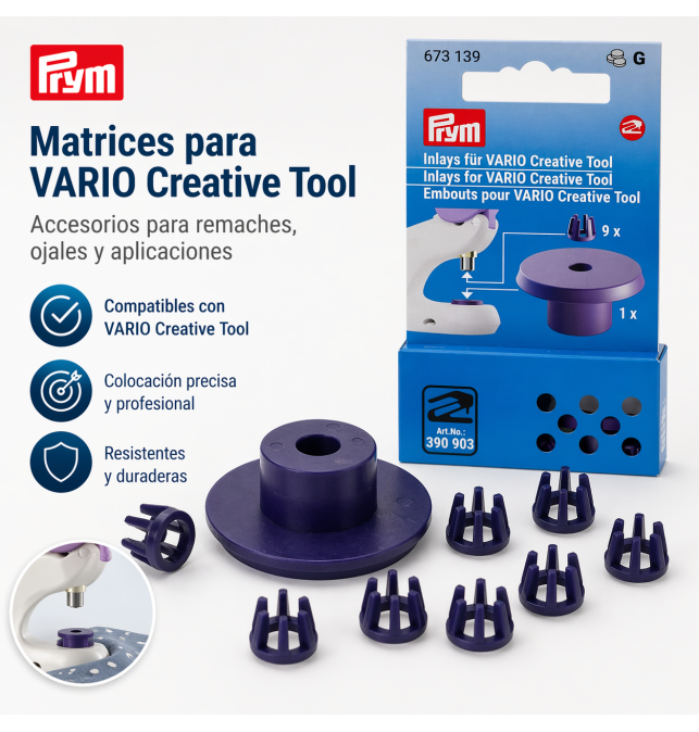 Las matrices Prym para VARIO Creative Tool son accesorios de precisión diseñados para facilitar la colocación de remaches, ojales y otros elementos decorativos o funcionales en tejidos y materiales similares. Están especialmente desarrolladas para su uso con la herramienta VARIO Creative Tool de Prym, garantizando un ajuste perfecto y resultados profesionales.