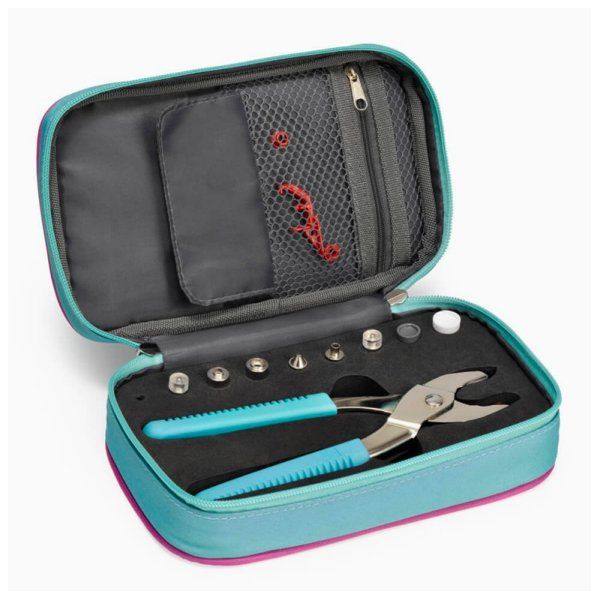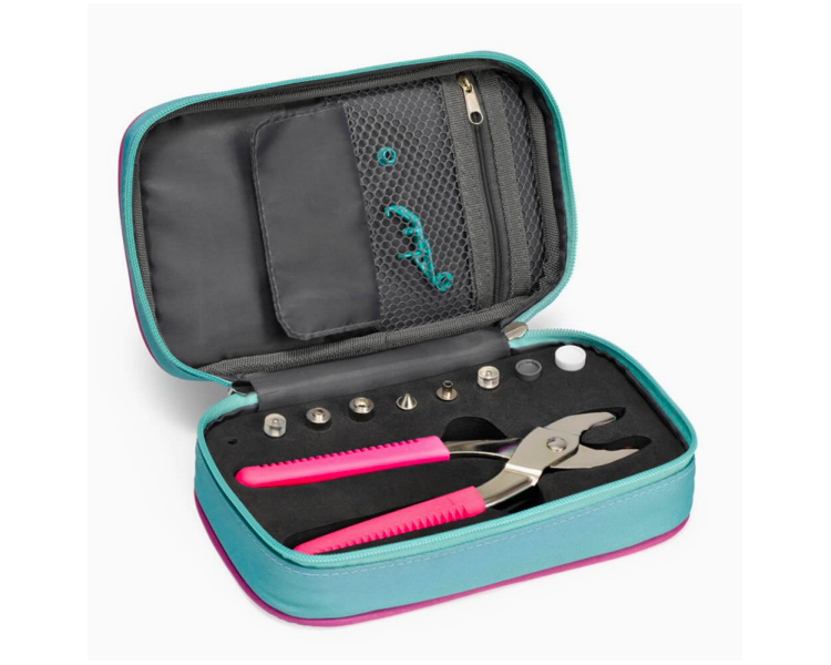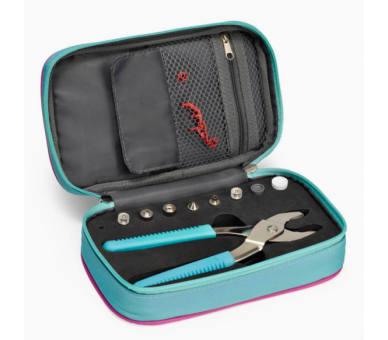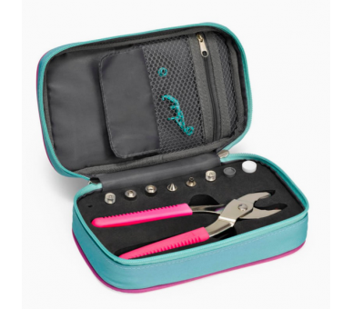 El estuche VARIO de Prym Love es el organizador perfecto para almacenar de forma segura la tenaza VARIO y 9 accesorios para esta herramienta, además, contiene dos bolsillos, uno con cierre de cremallera y otro con cierre de solapa, donde podrás organizar los botones a presión Snaps y otros accesorios.
