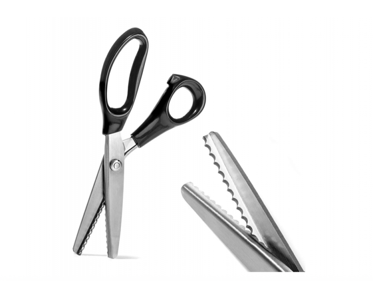 Versátiles tijeras dentadas: un artículo esencial para tu caja de costura. Versátiles tijeras dentadas: las cuchillas afiladas poseen dientes de sierra en lugar de un borde recto, dejando un patrón de zigzag mientras cortas, el patrón de diente de sierra puede limitar la longitud del hilo deshilachado de los bordes sin terminar de la tela y así minimizar los daños. (Nota: hay algo de aceite en las cuchillas, y evita la oxidación. Antes de usarlas, por favor, límpialas)